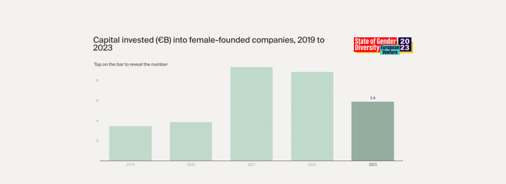 对欧洲女性创办公司的投资表明,人们越来越意识到性别不平等问题正在缓慢但確实改善。继 2021 年和 2022 年的峰值年之后,2023 年的融资额为 59 亿欧元,成为有史以来融资额第三高的年份。
